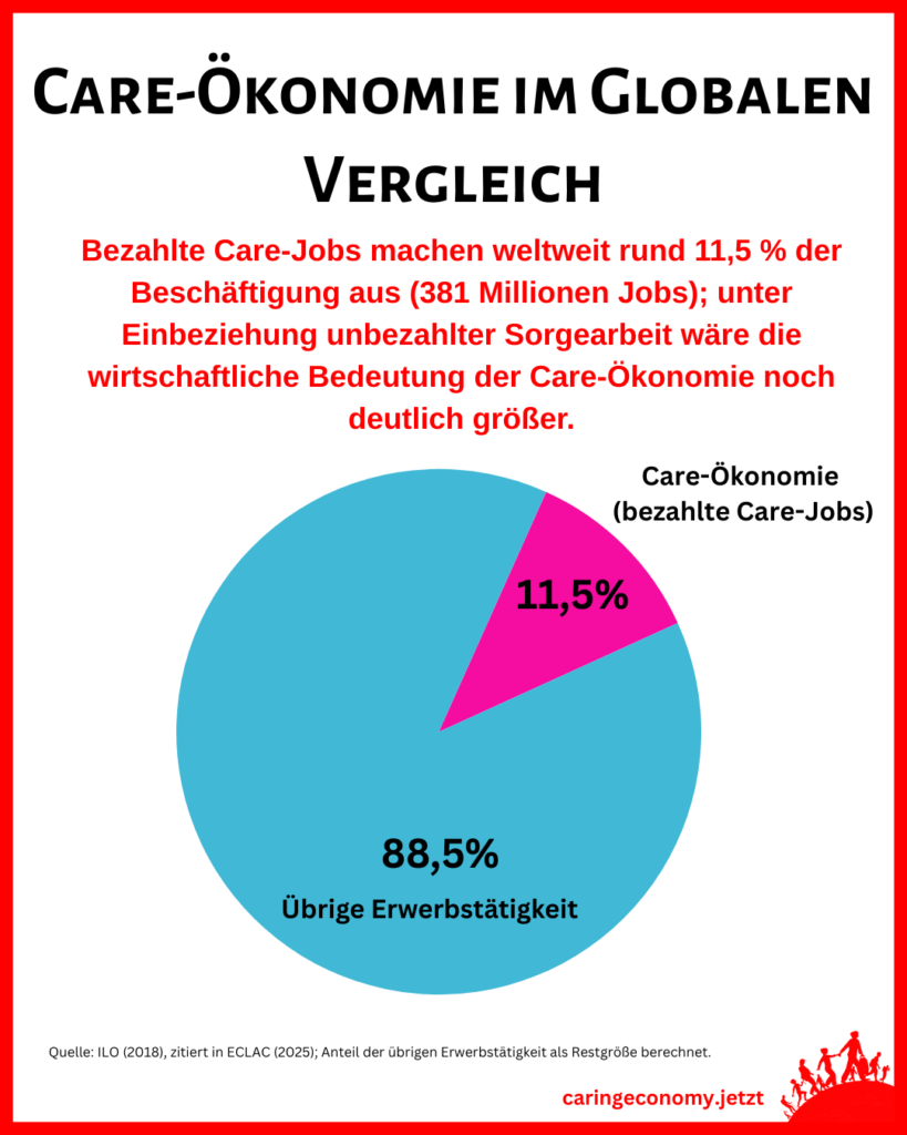Wie groß dieser Sektor bereits heute ist, zeigen Daten der Internationalen Arbeitsorganisation. Bezahlte Care-Jobs machten laut ILO-Schätzung für das Referenzjahr 2015 rund 11,5 % der globalen Beschäftigung aus – das entspricht etwa 381 Millionen Arbeitsplätzen (ILO 2018, zitiert in ECLAC 2025). Unter Einbeziehung unbezahlter Sorgearbeit wäre die wirtschaftliche Bedeutung der Care-Ökonomie nach gängigen Satellitenrechnungen noch deutlich größer, da diese in der genannten Kennzahl nicht enthalten ist.