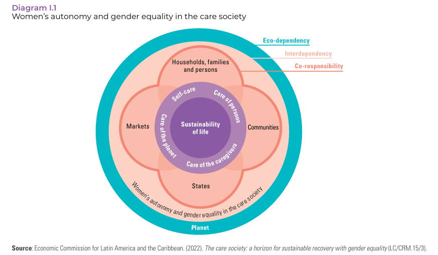 Bereits in ihrem grundlegenden Konzeptpapier zur Care Society betonte die ECLAC (2022) die Notwendigkeit eines Paradigmenwechsels, bei dem die Nachhaltigkeit des Lebens und des Planeten ins Zentrum wirtschaftlicher Entwicklung rückt. Dieses neue Entwicklungsverständnis verbindet Geschlechtergleichstellung mit ökonomischer, sozialer und ökologischer Transformation.
