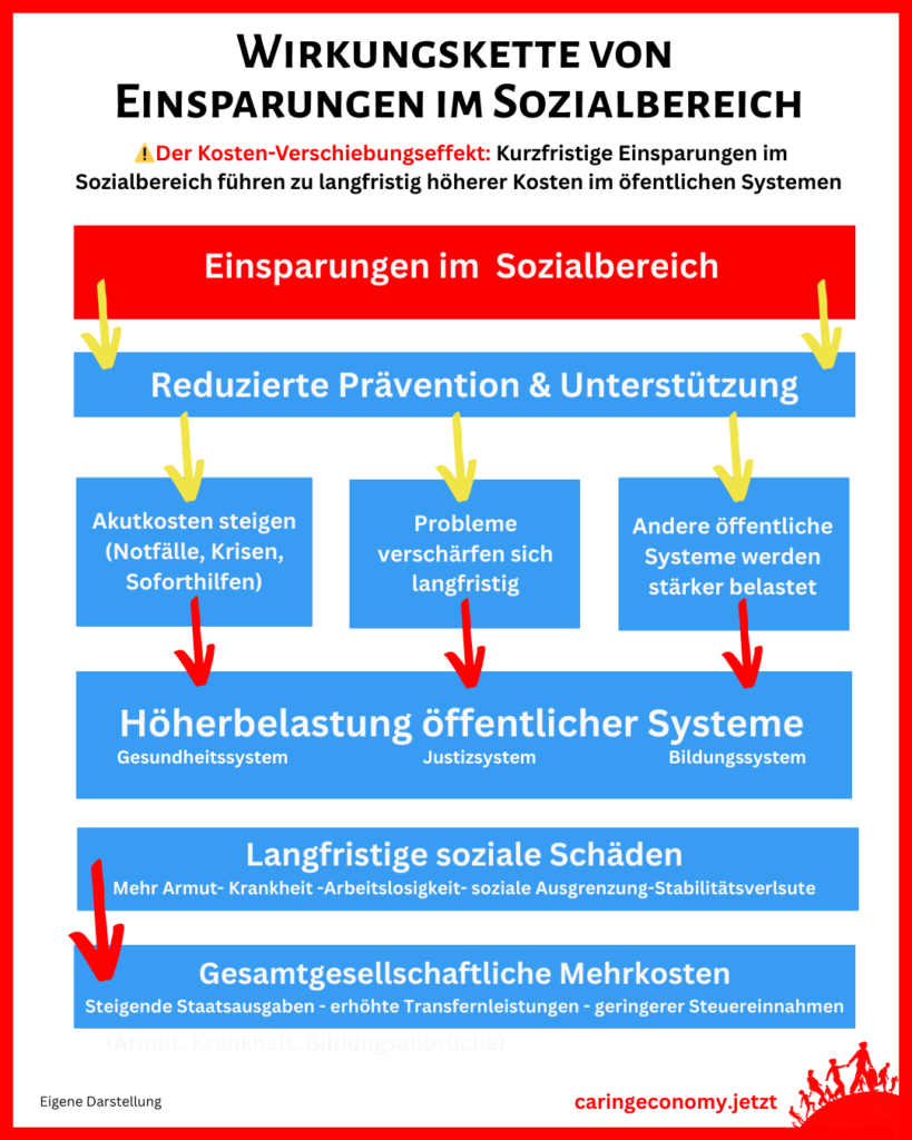 Einsparungen im Sozialbereich mögen zwar kurzfristig zu einer Entlastung öffentlicher Haushalte führen, verursachen jedoch häufig erhebliche direkte und indirekte Folgekosten. Direkte Folgekosten entstehen unmittelbar durch den Abbau sozialer Leistungen und präventiver Angebote. Wird etwa bei sozialer Unterstützung, Pflege oder Prävention gespart, steigt der Bedarf an kostenintensiven Akutmaßnahmen im Gesundheitswesen, etwa durch vermehrte Krankenhaus- und Notfallbehandlungen. Gleichzeitig erhöhen strengere Zugangsregeln und Leistungskürzungen den Verwaltungsaufwand, sodass Einsparungen teilweise durch steigende Bürokratiekosten wieder aufgehoben werden.